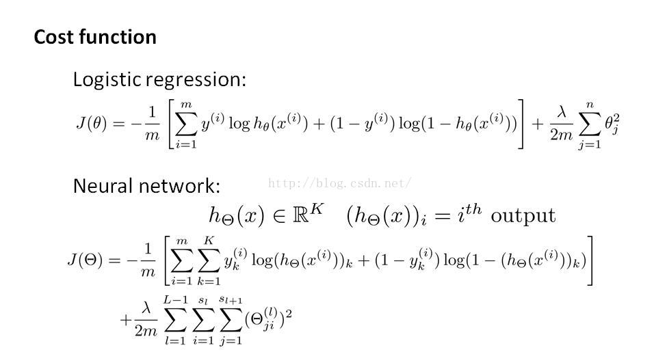 神经网络会有多个隐藏层,相当于在原来的二维矩阵运算上又增加了一个维度,所以代价函数J(Θ)的表达也显得很复杂,你可以理解为各层代价函数(误差函数)之和。从下图你也可以很好的发现,神经网络就是逻辑回归的推广,逻辑回归可看成没有隐藏层的神经网络。