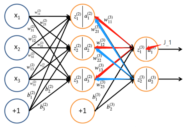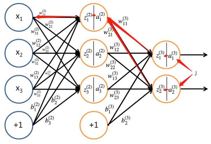 frac{partial J}{partial w^{(3)}_{11}}=delta^{(3)}_1a^{(2)}_1
