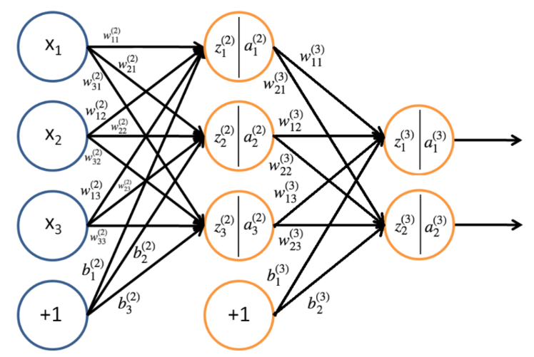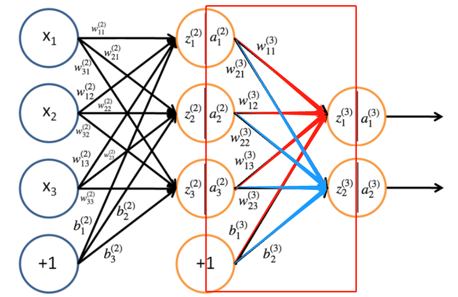 frac{partial J}{partial w^{(3)}_{32}}=delta^{(3)}_2a^{(2)}_3