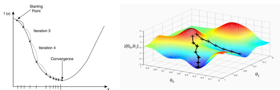 3、更新参数(目标是误差变小)。迭代前面两个步骤,直到满足停止准则(比如相邻两次迭代的误差的差别很小)