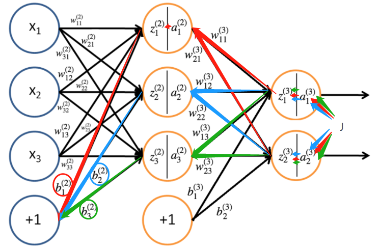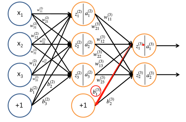 frac{partial J}{partial b^{(2)}_3} = frac{partial J}{partial a^{(3)}_1}frac{partial a^{(3)}_1}{partial z^{(3)}_1}frac{z^{(3)}_1}{a^{(2)}_3}frac{a^{(2)}_3}{z^{(2)}_3}frac{z^{(2)}_3}{b^{(2)}_3}+frac{partial J}{partial a^{(3)}_2}frac{partial a^{(3)}_2}{partial z^{(3)}_2}frac{z^{(3)}_2}{a^{(2)}_3}frac{a^{(2)}_3}{z^{(2)}_3}frac{z^{(2)}_3}{b^{(2)}_3}