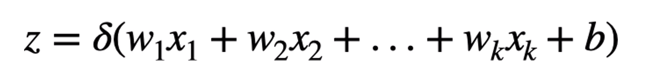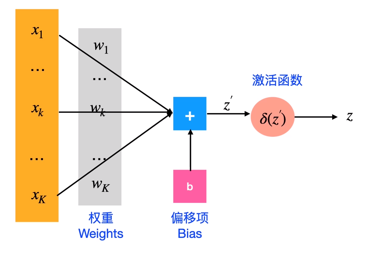 其中,x1,x2,...,xk 为输入;w1,w2,..,wk 为权重;b 为偏移项;δ 则为激活函数。