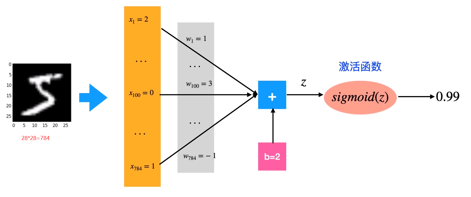 因为每张图片是 28x28 像素的,所以我们将图片按行列展开(28*28像素=784个像素点,长度为 784 的向量)为 x1, x2,...,x784,输入的下标的范围是 1 到 784。将它们输入到以{w1, w2, ..., w784; b}为参数的神经元中。假设输出 z 为 20,经过 Sigmoid 函数我们会将 z 转换为概率,通过计算可得概率为 99%。如下图所示: