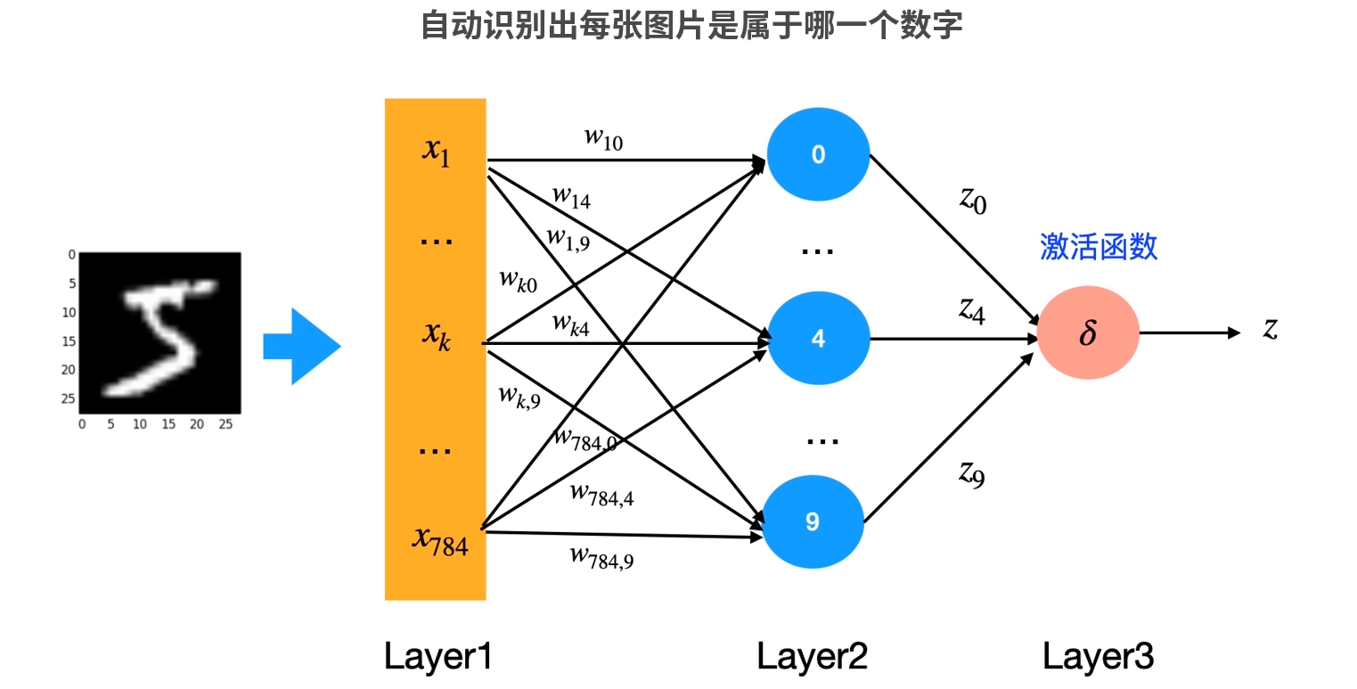 这样,我们将输出的 z0, z1, ..., z9 输入到 Softmax 激活函数后,可以获得一组概率值。通过判断哪个神经元输出的概率最大,就可以推断出输入图片所属的类别。