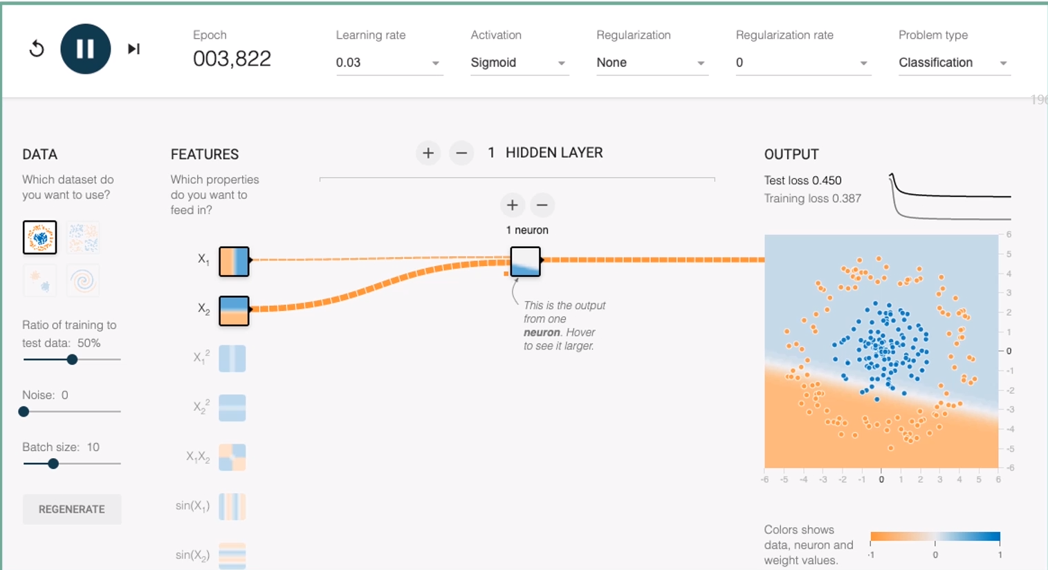 我们看看下面这个例子: 2 个输入(x1 与 x2),1 个神经元,激活函数为 Sigmoid,需要对右侧的 output 进行预测。output 一共有 2 个类别,黄色的点与蓝色的点,并且两类处于一种非线性关系。