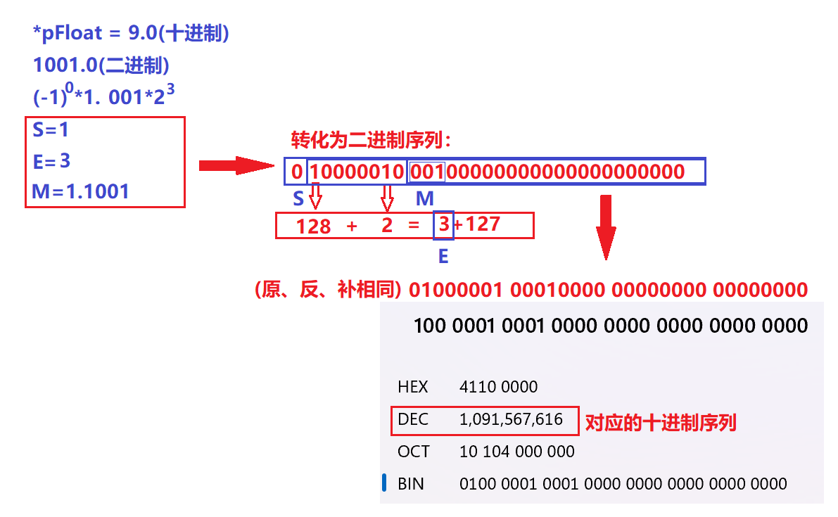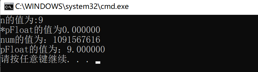 int main() { int n = 9; float* pFloat = (float*)&n; printf("n的值为:%dn", n); printf("*pFloat的值为%fn", *pFloat); *pFloat = 9.0; printf("num的值为:%dn", n); printf("pFloat的值为:%fn", *pFloat); return 0; }第一个输出:以整型存放,以整型拿出,结果为9的结果毋庸置疑