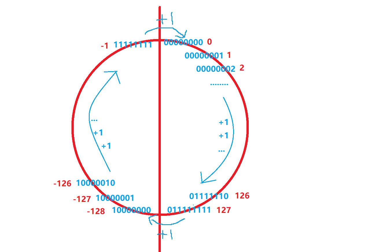 其实我们可以把char型变量不断+1这个过程看成一个循环(其他类型的变量也是一个道理,大家可以自己推推short类型的取值范围),如下图: