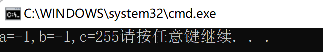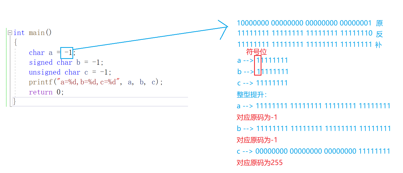 int main() { char a = -1; signed char b = -1; unsigned char c = -1; printf("a=%d,b=%d,c=%d", a, b, c); return 0; }解析:上题中a b c均为char型,存储-1时都会从最低字节数据进行截断,在打印的时候又以%d形式输出,会得到整型提升 而在vs中char == signed char,也就是有符号整型,因此a和b进行截断的时候最高位是符号位,整型提升时补符号位1;而unsigned char是无符号整型,因此c对-1进行截断时最高位不是符号位,因此整型提升时补0。