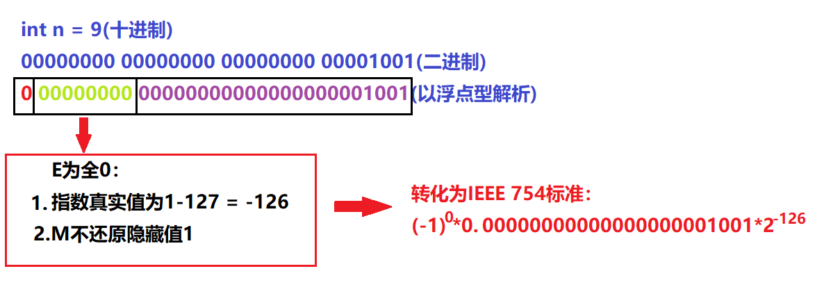 - E为全0:浮点数的指数E=1-127(或1023),并且M不还原隐藏位'1'。