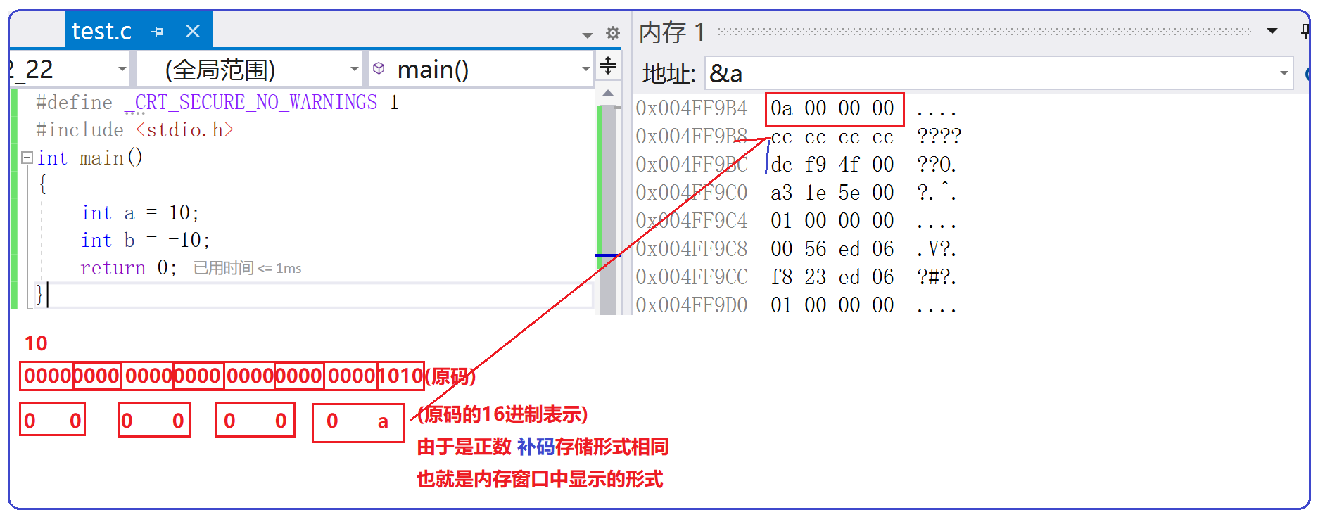 我们知道a分配四个字节的空间,那么该如何存储?