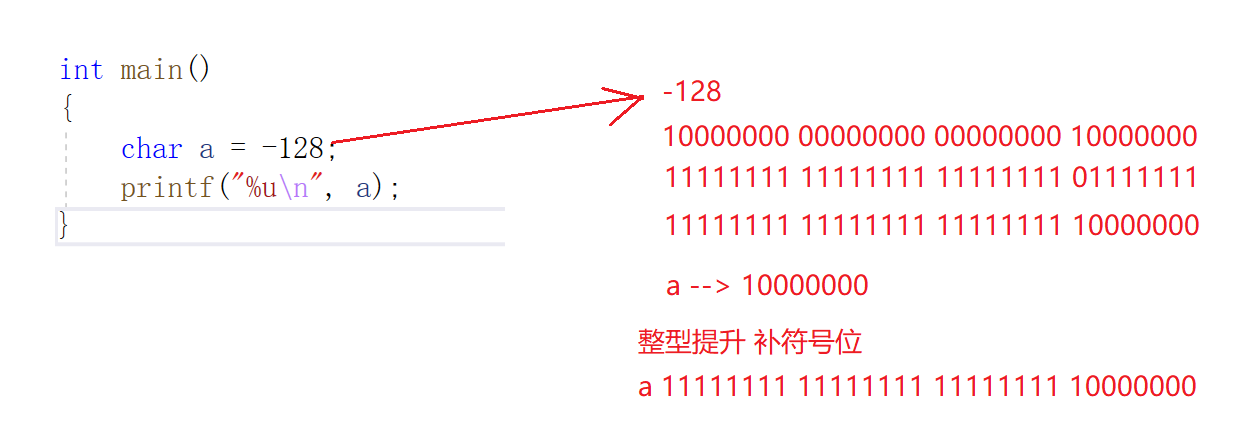 2.int main() { char a = -128; printf("%un", a); }解析:截断和整型提升与上题道理一样,然后此次以%u输出,也就是无符号位,因此11111111 11111111 11111111 10000000就是实际值。