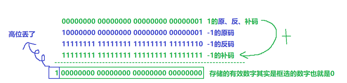 原因是计算机中只有加法器:1-1其实就是1+(-1)