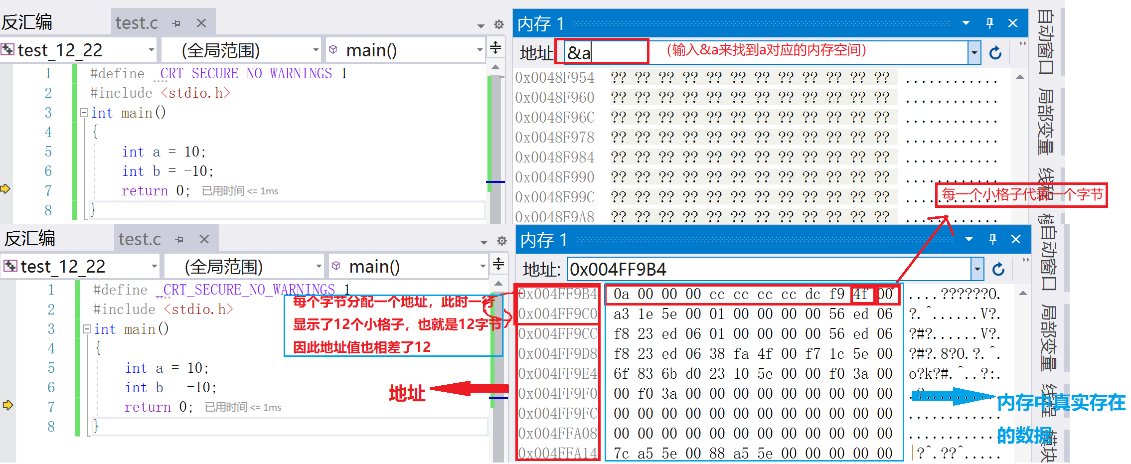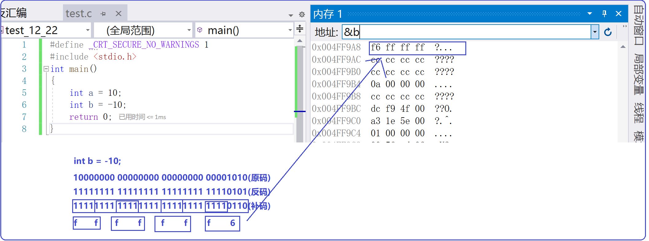 我们可以用vs2019的调试窗口中的内存来观察。内存中存放的实际上是二进制,但在窗口中用十六进制表示,一个十六进制数可以表示四位二进制数,因此用十六进制展示更加简洁: