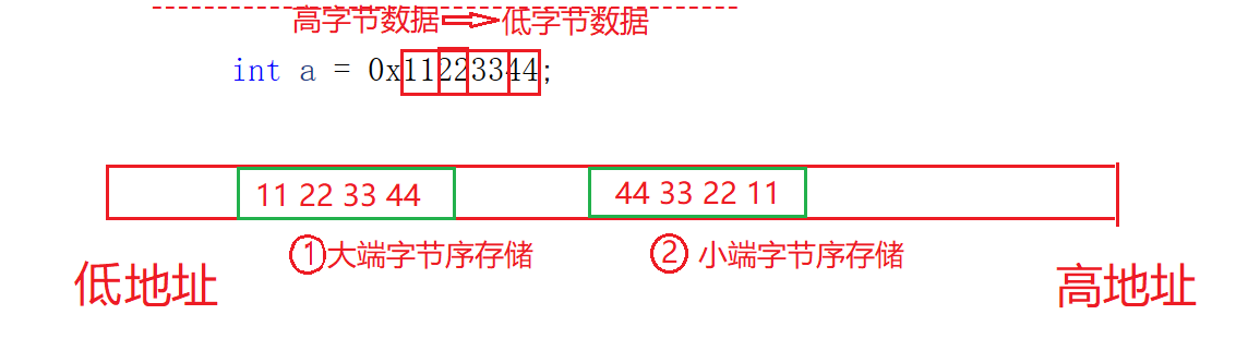 如下图定义一个变量 int a = 0x11223344 从11到44是从高字节数据到低字节数据:
