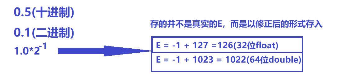上图:0.5的二进制形式为0.1,由于规定正数部分必须为1,即将小数点右移一位变成1.0*2^-1的形式,其E为-1+127=126,表示为01111110;其M为1.0去掉整数部分即为0,补齐0到23位000000000000000000000000;因此其二进制表示形式为: