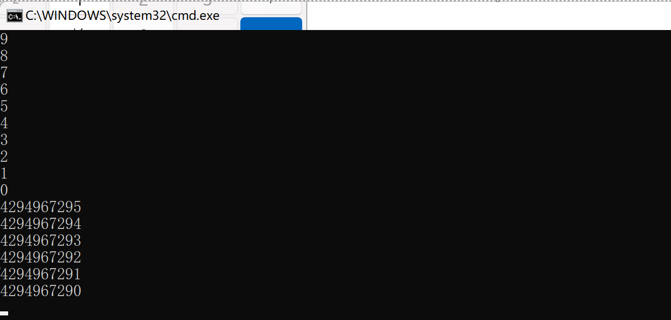 int main() { unsigned int i; for (i = 9; i >= 0; i--) { printf("%un", i); Sleep(1000); } return 0; }解析:由于unsigned int为无符号数,里面不会存放负数,当因此i从9开始打印到0之后,再i--就会把-1放到一个无符号的整型里面去,对应的补码也就是11111111 11111111 11111111 11111111而每一位都是有效位,对应的正数4294967295,然后一直死循环下去...