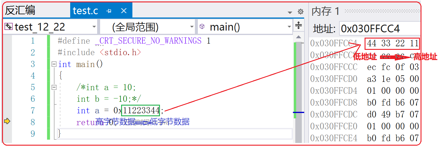 如下图编译器中的存储方式是小端字节序存储,也就是低对低,高对高。