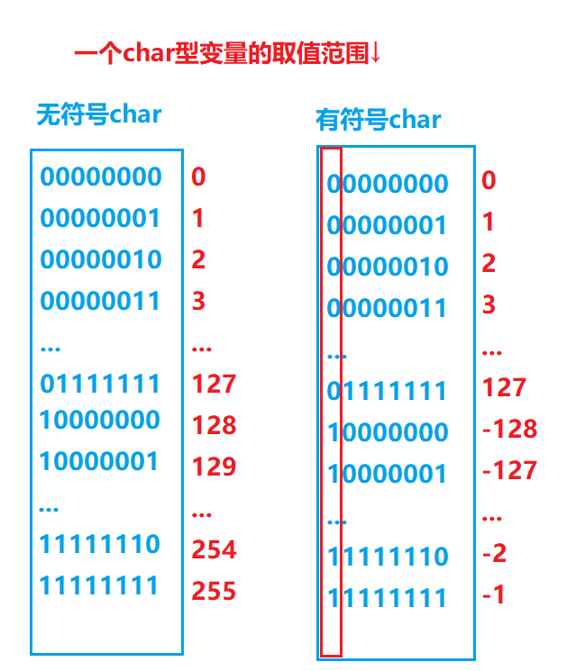 有符号char:第一位(红色框内)为是符号位,从最底下的11111111对应的原码为-1依次向上递减到-127都可以计算出其对应的原码,也就是-1 ~ -127,直到10000000的时候是不需要计算的:只要二进制序列中是符号位为1,后面的都为0的时候(无法先-1后取反得到原码)会直接解析,此时10000000直接被解析为-128,因此取值范围是-128~127。