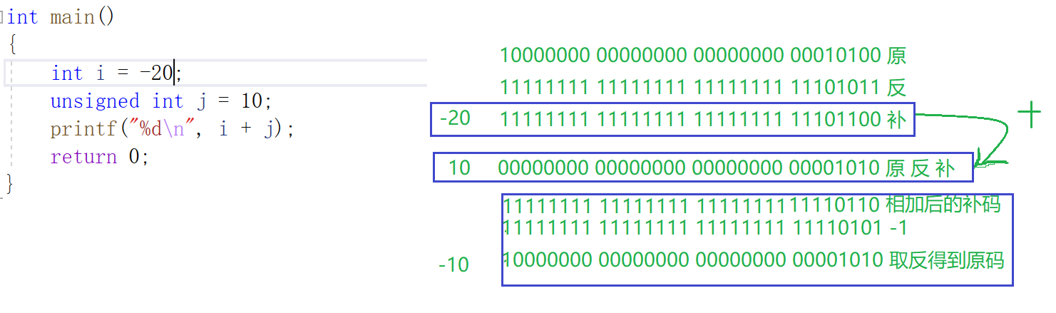 int main() { int i = -10; unsigned int j = 10; printf("%dn", i + j); return 0; }