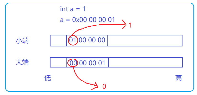 int main() { int a = 1; char* p = (char*)&a; if(*p == 1) { printf("小端n"); } else { printf("大端n"); } return 0; }