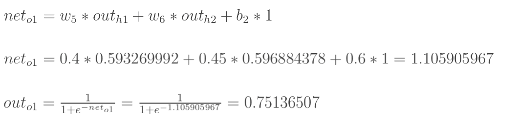 神经元h1的输出o1:(此处用到激活函数为sigmoid函数):