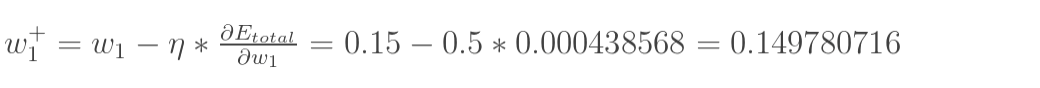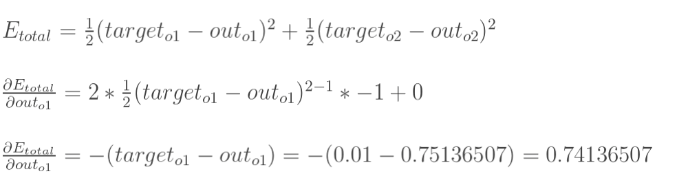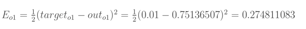 这样前向传播的过程就结束了,我们得到输出值为[0.75136079 , 0.772928465],与实际值[0.01 , 0.99]相差还很远,现在我们对误差进行反向传播,更新权值,重新计算输出。