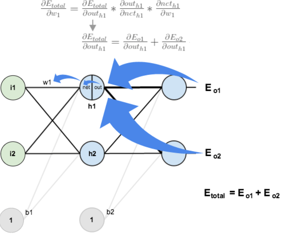 方法其实与上面说的差不多,但是有个地方需要变一下,在上文计算总误差对w5的偏导时,是从out(o1)---->net(o1)---->w5,但是在隐含层之间的权值更新时,是out(h1)---->net(h1)---->w1,而out(h1)会接受E(o1)和E(o2)两个地方传来的误差,所以这个地方两个都要计算。