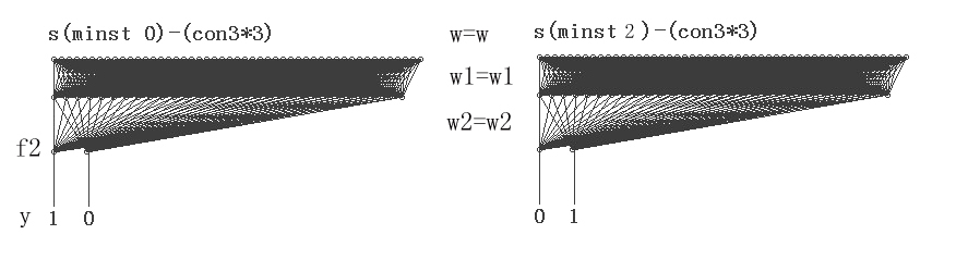 这个网络由两部分组成,左右两边分别向1,0和0,1收敛,左边输入minst的0,右边输入minst的2,让左右两个网络的权重部分共享,实现耦合达到分类的目的。