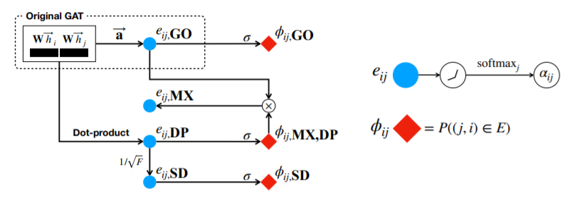 原始GAT与SuperGAT对比:原始的GAT如矩形图中所示。SuperGAT通过一对节点中是否存在边来引导注意力。用 和 表示节点 和节点 之间有边的概率 ,即