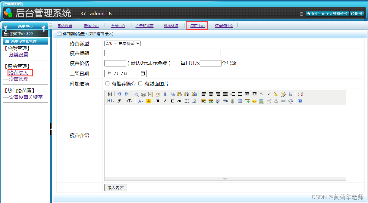 录入疫苗:录入疫苗名称、价格、封面、介绍内容等