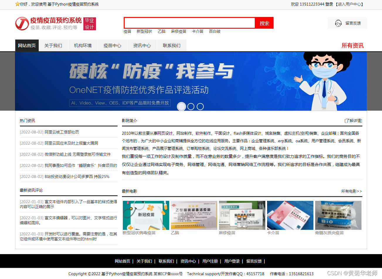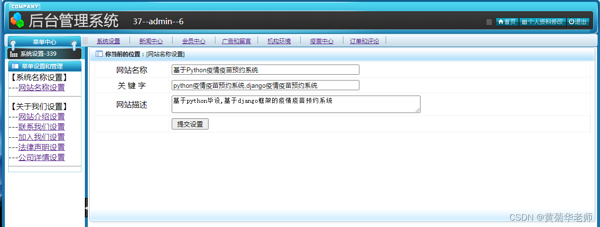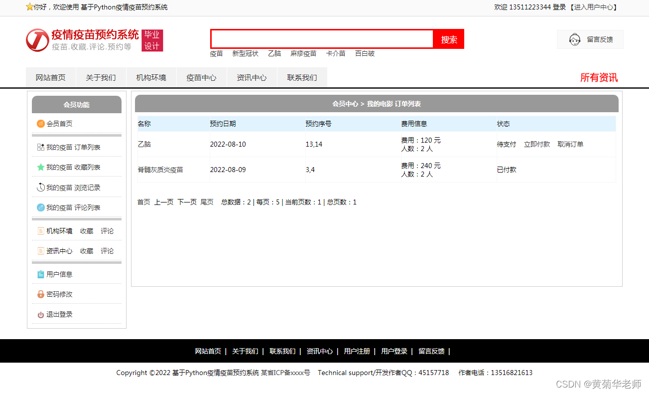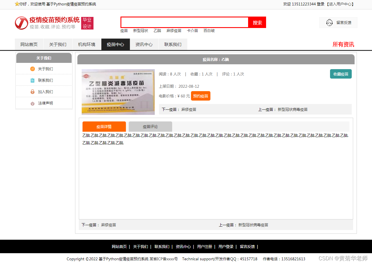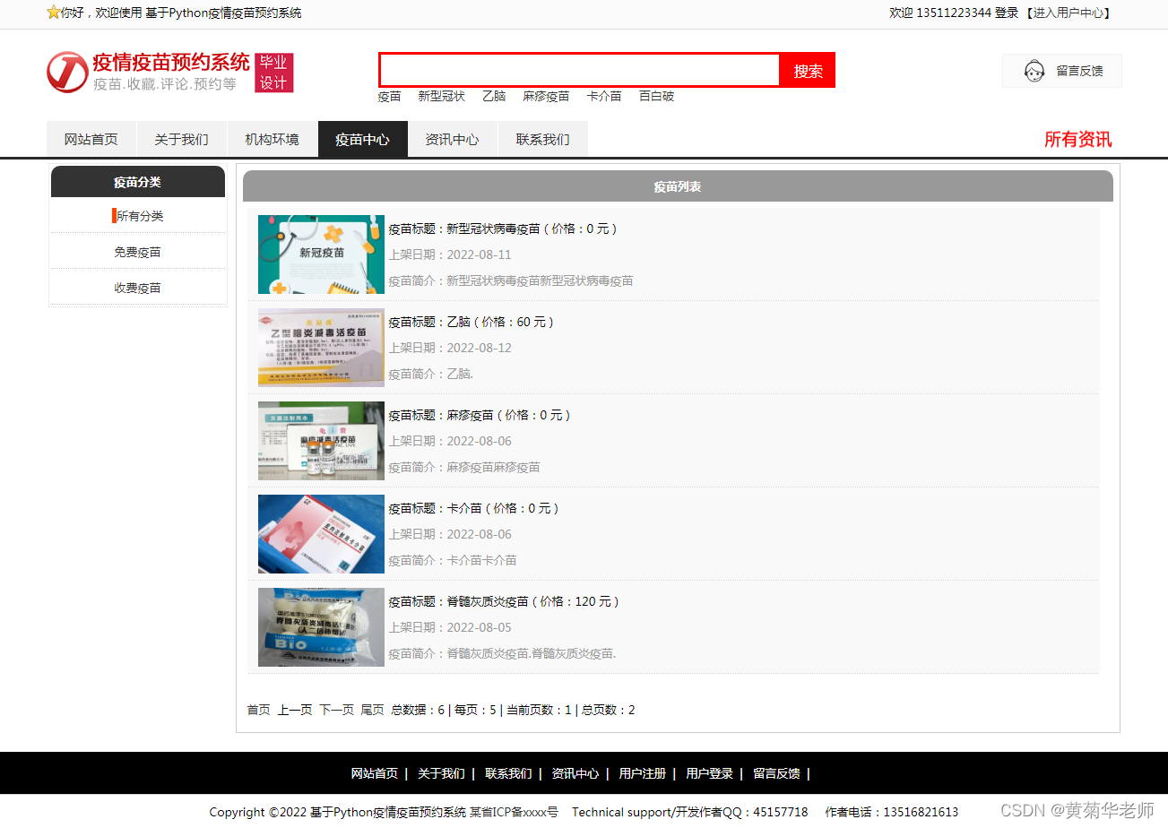 目的:本课题主要目标是设计并能够实现一个基于web网页的疫苗预约系统,整个网站项目使用了B/S架构,基于python的Django框架下开发;管理员通过后台录入信息、管理信息,设置网站信息,管理会员信息,管理和设置广告、留言、录入疫苗信息、疫苗管理、订单管理等;用户通过登录网站,查询查看新闻资讯、发表评论、查看疫苗列表、查看疫苗详情信息、预约疫苗等。