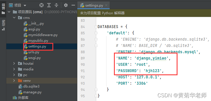Cms/settings.py 设置数据库和账号,大约在代码第90行左右