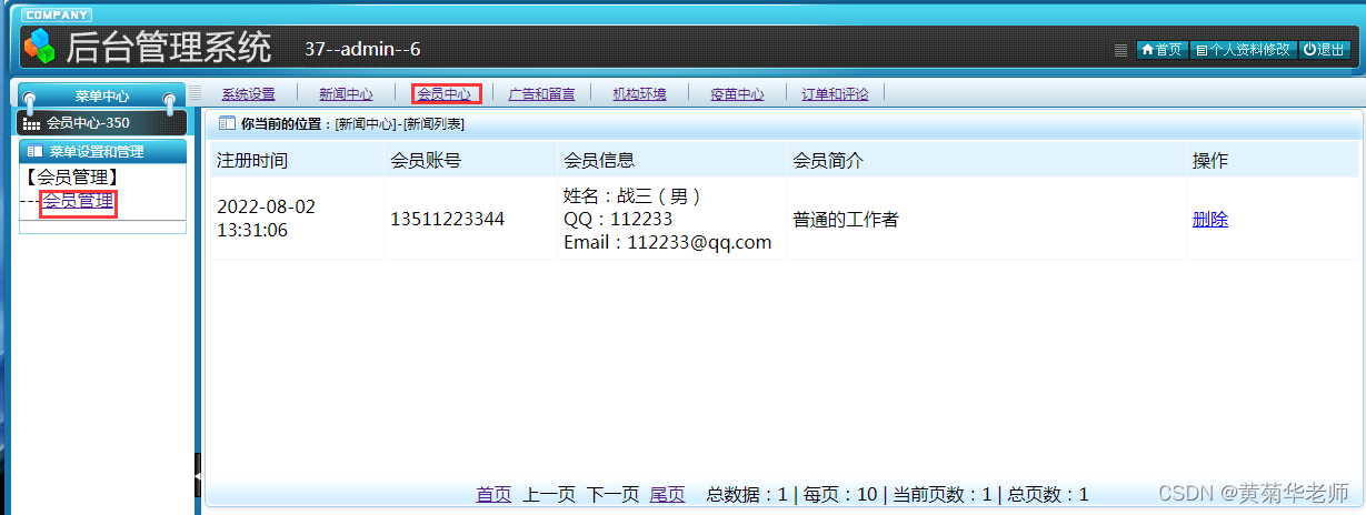 会员列表:查看所有注册会员信息,支持删除