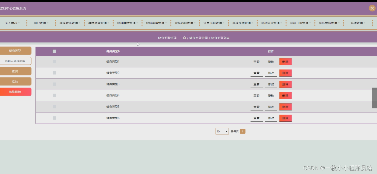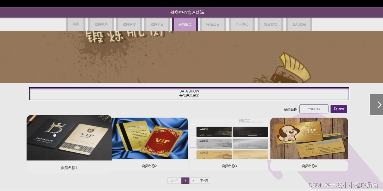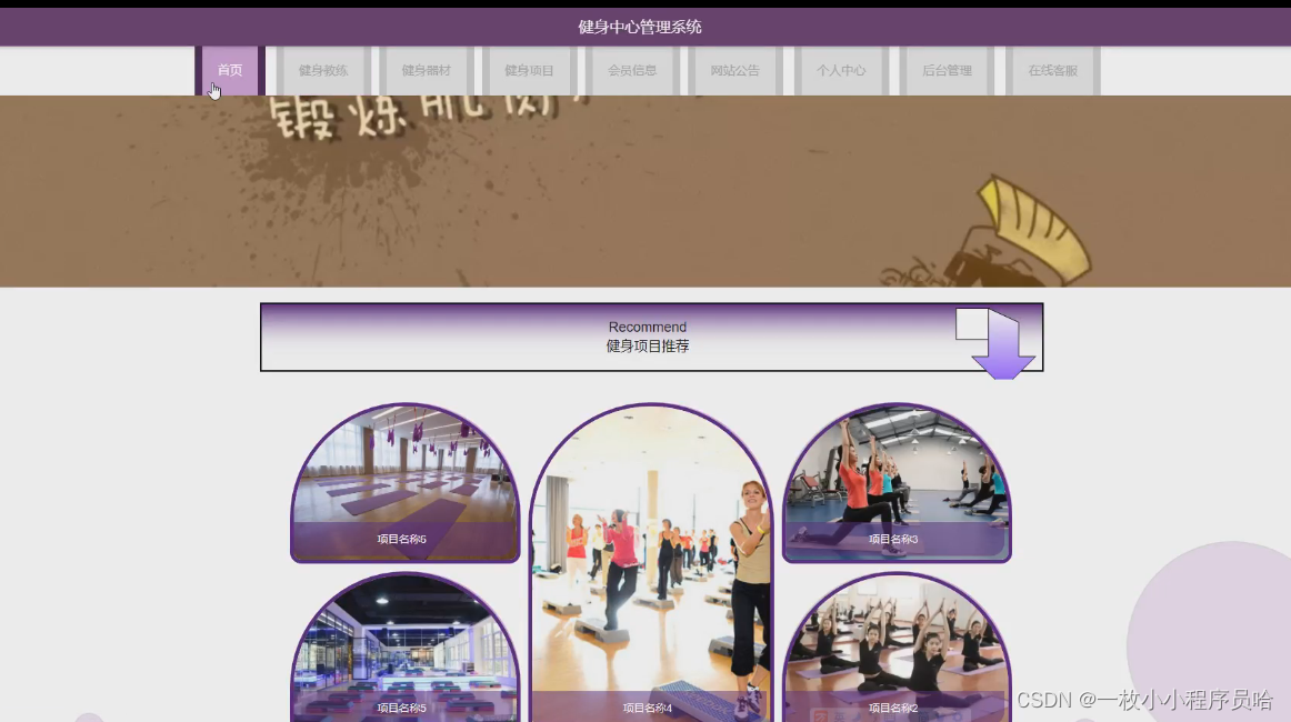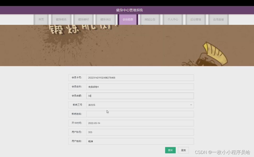主要对个人中心、用户管理、健身教练管理、器材类型管理、健身器材管理、健身类型管理、健身项目管理、订单信息管理、健身预约管理、会员信息管理、会员开通管理、会员充值管理、系统管理的实现。
