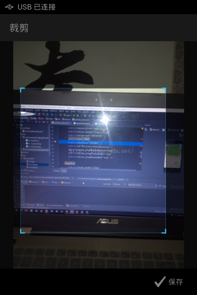 3.主要分为两个类写的,第一个类就是进行照完的人脸进行裁剪类,这个是使用android自带的裁剪器,进行相应的配置,这个类里面主要是裁剪,对摄影的角度的判断,旋转图片,保存图片这几个方法。