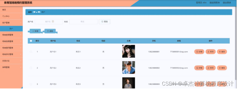 用户管理,在用户管理页面可以对索引,用户名,姓名,性别,头像,手机,邮箱等内容进行详情,修改和删除等操作,如图5-7所示。