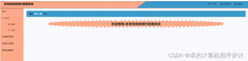 用户登录系统后,可以对首页,个人中心,场地预约管理,场地评论管理,我的收藏管理等功能进行相应的操作管理,如图5-11所示。