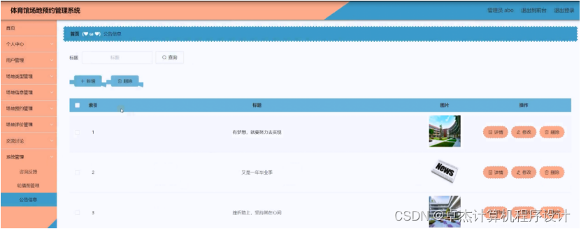 系统管理,在公告信息页面可以对索引,标题,图片等内容进行详情,修改和删除等操作,还可以对咨询反馈和轮播图管理进行详细的操作管理;如图5-10所示。