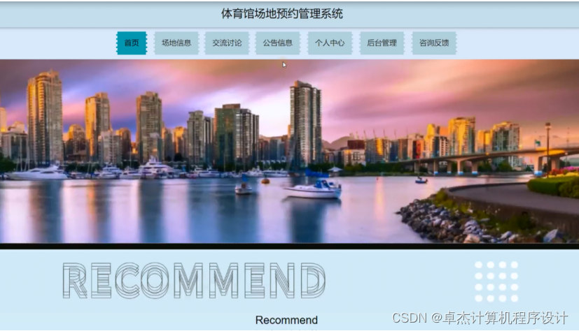 体育馆场地预约管理系统,在系统首页可以查看首页,场地信息,交流讨论,公告信息,个人中心,后台管理,咨询反馈等内容,并进行详细操作;如图5-1所示。