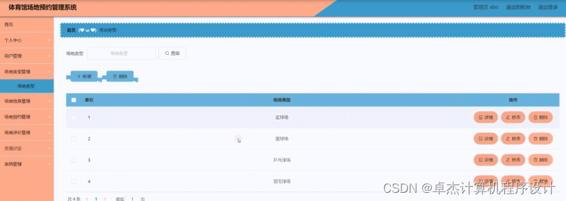 场地类型管理,在场地类型管理页面可以对索引,场地类型等内容进行详情,修改和删除等操作,如图5-8所示。