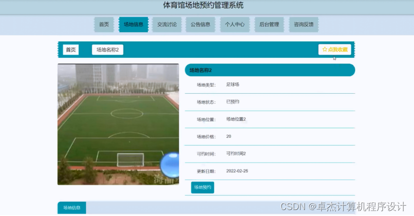 场地信息,在场地信息页面可以查看场地名称,场地类型,场地状态,场地位置,场地价格,可约时间,更新日期等内容进行场地预约,收藏操作,如图5-2所示。