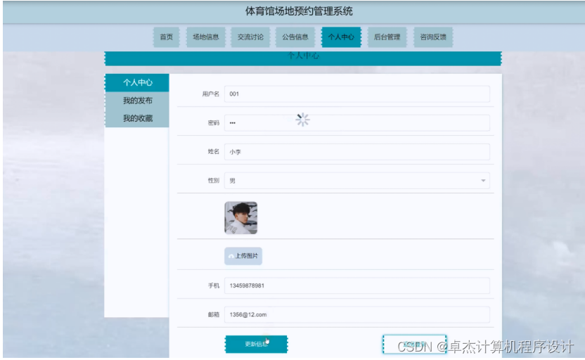 个人中心,在个人中心页面通过填写用户名,密码,姓名,性别,上传图片,手机,邮箱等内容进行更新信息,并对我的收藏和我的发布进行操作,如图5-4所示。