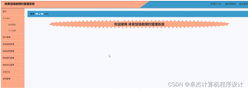 管理员登录系统后,可以对首页,个人中心,用户管理,场地类型管理,场地信息管理,场地预约管理,场地评论管理,交流讨论,系统管理等功能进行相应的操作管理,如图5-6所示。
