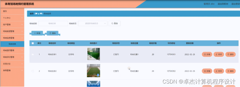 场地信息管理,在场地信息管理页面可以对索引,场地名称,场地类型,场地图片,场地状态,场地位置,场地价格,可约时间,更新日期等内容进行详情,修改和删除等操作,如图5-9所示。