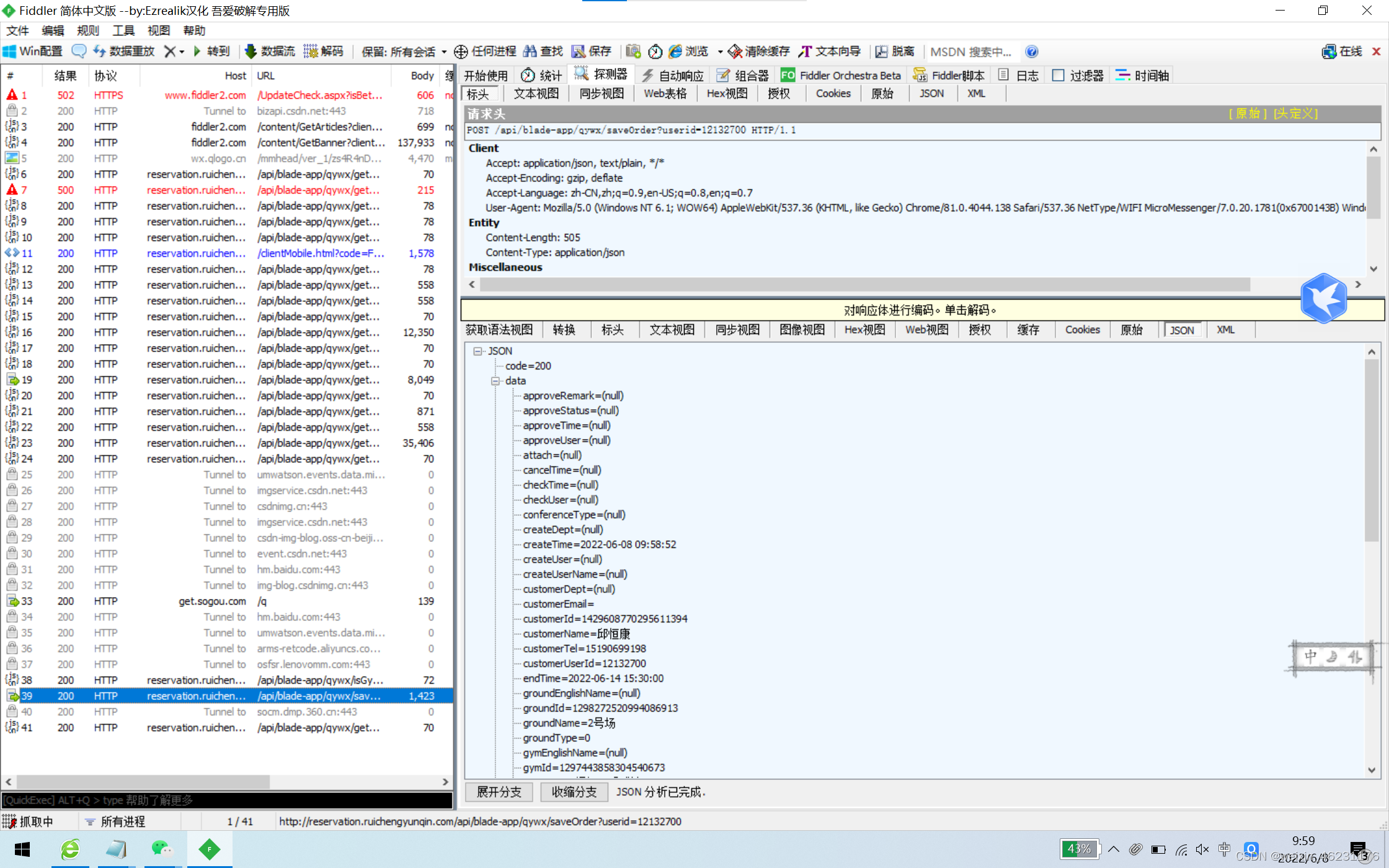 首先呢,先手动预约一下,同时用fiddler看下接口,找到url,header,以及发送的内容