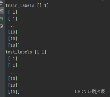 在运行代码时,一直出现这个错误,大意为数据集形状不兼容,即维度不一样,找了很久一直没有找到问题的根源,最后灵机一动,想着打印一下训练集与测试集的标签看看,于是: