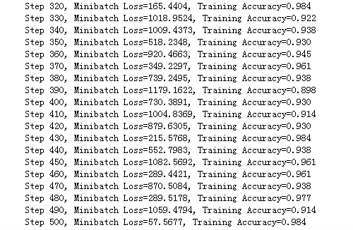 print("Step " + str(step) + ", Minibatch Loss={:.4f}".format(loss) + ", Training Accuracy={:.3f}".format(acc))