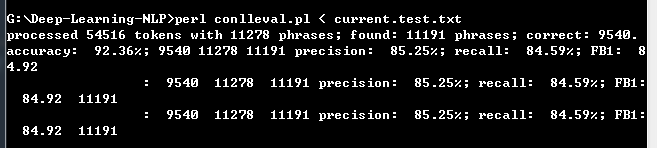 # 输出结果,用于脚本conlleval.pl的精度测试,该脚本需要自己下载,在windows下调用命令为:perl conlleval.pl < filename