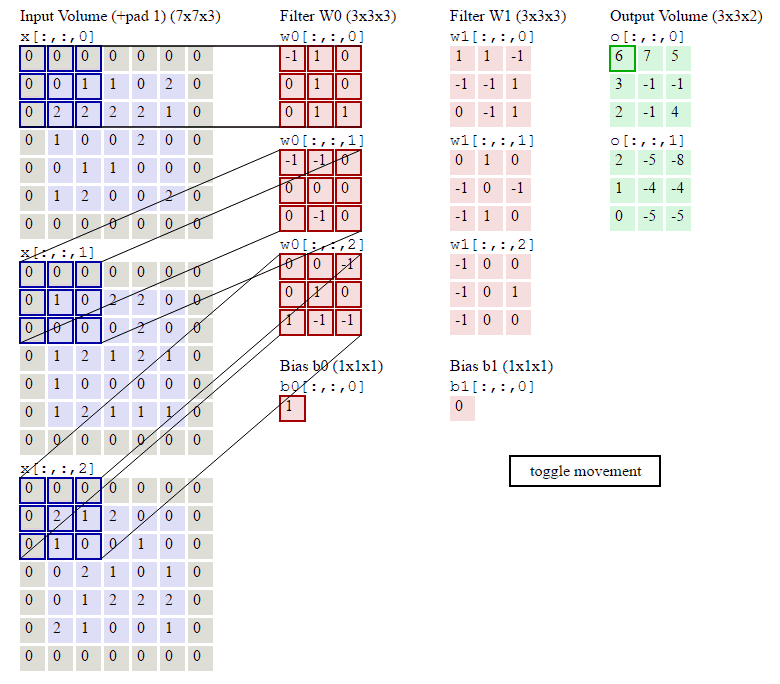 更直观的,给出如下动画。下图包含两个过滤器的卷积层的计算。可以看到
