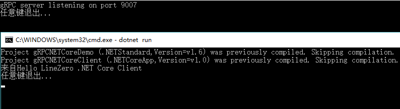 public class Program { public static void Main(string[] args) { Encoding.RegisterProvider(CodePagesEncodingProvider.Instance); Channel channel = new Channel("127.0.0.1:9007", ChannelCredentials.Insecure); var client = new gRPC.gRPCClient(channel); var reply = client.SayHello(new HelloRequest { Name = "LineZero .NET Core Client" }); Console.WriteLine("来自" + reply.Message); channel.ShutdownAsync().Wait(); Console.WriteLine("任意键退出..."); Console.ReadKey(); } }